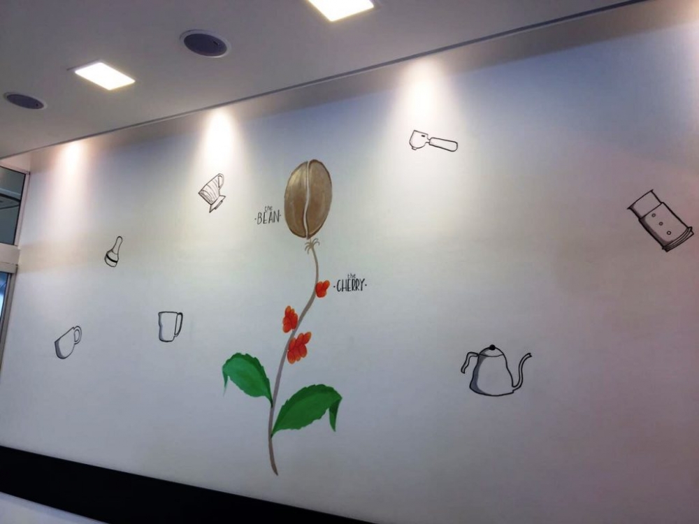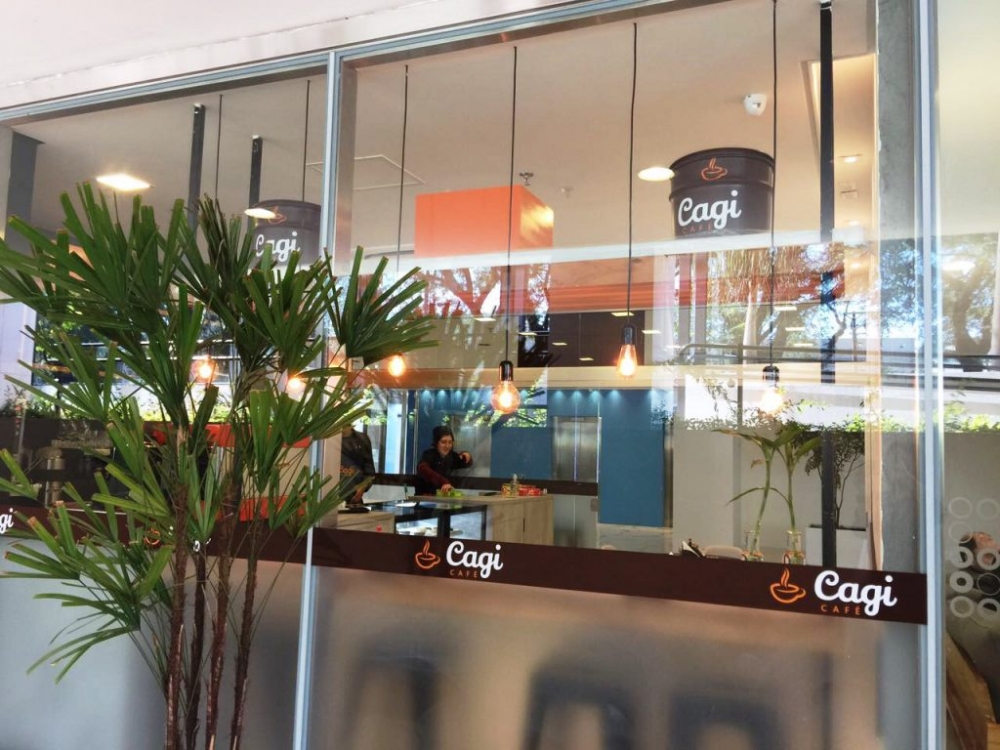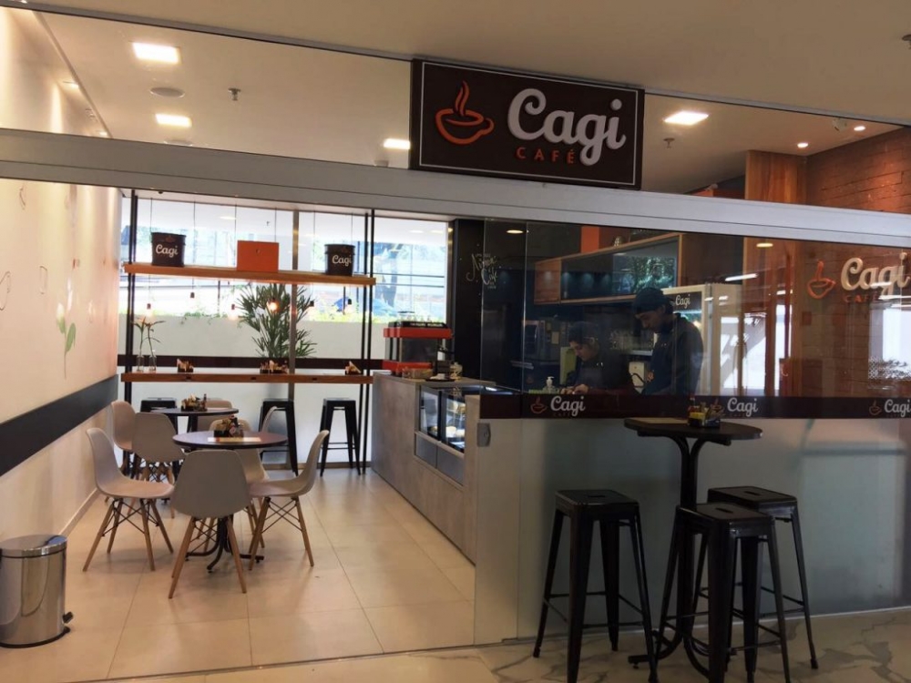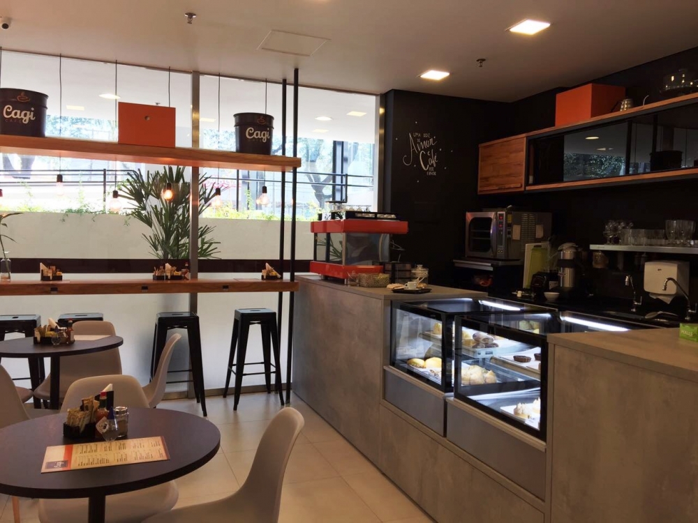 Projeto e acompanhamento de obra da 2a unidade do Cagi café executado com balcão de madeira de demolição e MDF tipo cimento queimado e estruturas de ferro tubular