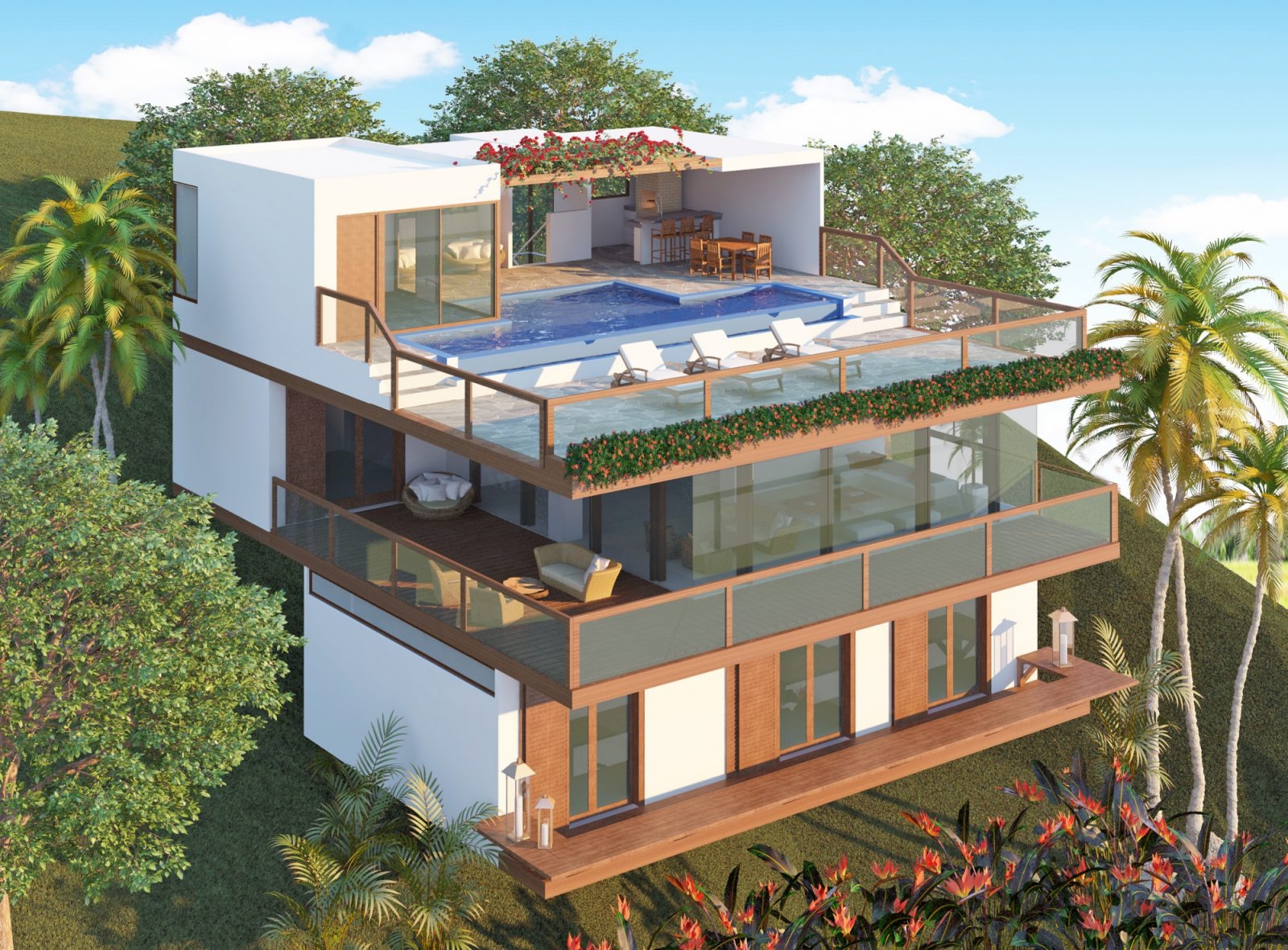 Projeto para um conjunto residencial de oito casas localizado em terreno de acentuado aclive, com vista para a orla. Cada residência tem 3 pavimentos, sendo que o acesso se dá pelo 2º pavimento (intermediário)