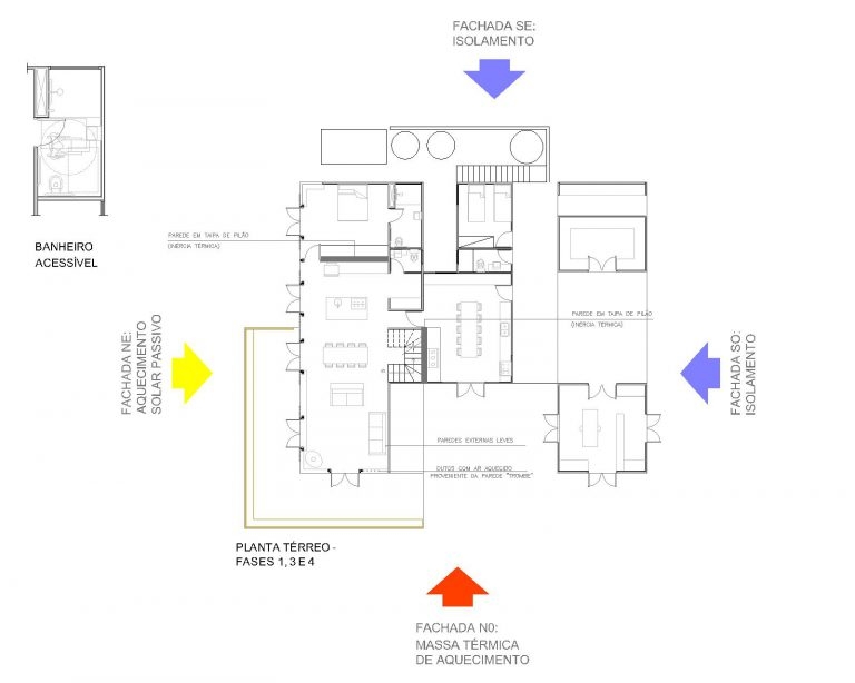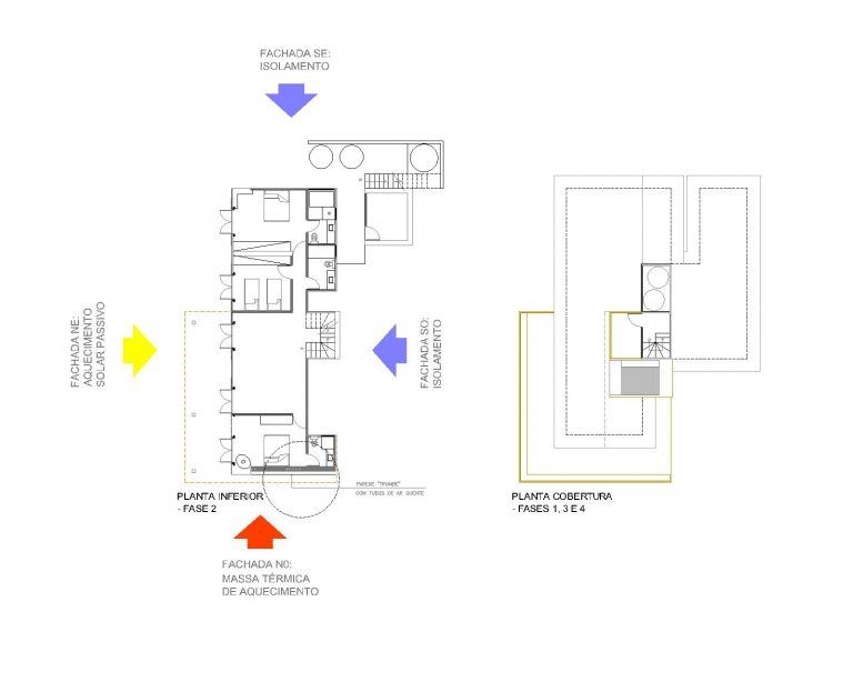 Foram adotadas para o projeto estratégias de conforto para a Zona Bioclimática 2: aquecimento artificial, orientação da edificação de forma a absorver a radiação solar, adoção de paredes internas pesadas (taipa de pilão), desumidificação (por meio da ventilação), vedações externas leves e cobertura leve isolada. O aquecimento se dá também de forma passiva por meio de “paredes trombe” compostas por uma superfície de pedra coberta por um vidro; a radiação que atravessa o vidro é armazenada pela pedra e irradiada para o ar contido entre estas superfícies, o qual é conduzido para dentro da edificação por meio de dutos de ar.